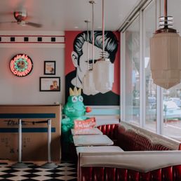 Its a 50's retro dinner they mostly serve desserts but they have sandwiches too. Its a little overwhelming at first when you see all the desserts and there are lots to choose from. Service is quick and friendly The atmosphere is happy and light.